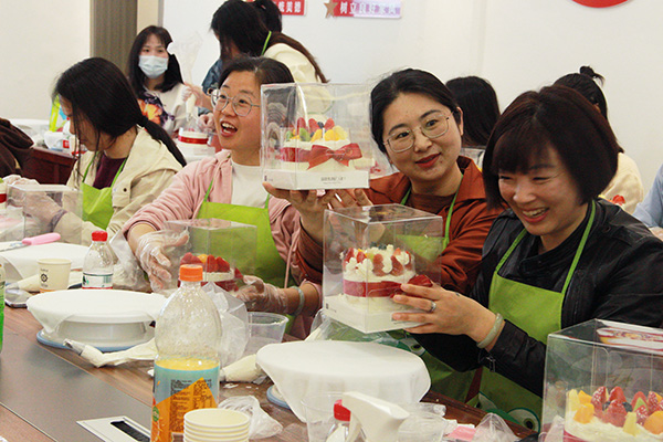 会议室里充满欢声笑语,洋溢着浓厚的节日气氛。女老师们在蛋糕师的指导下现场学习蛋糕制作,体验手工做蛋糕的快乐。经过精心设计和有创意的尝试,一个小时以后,一个个精美的水果奶油蛋糕呈现在眼前。
