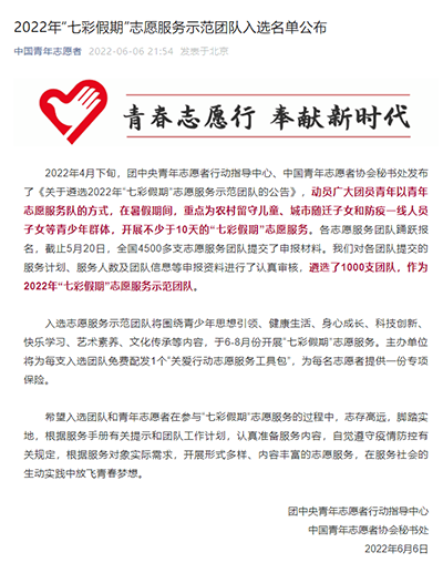 此次全国共有4500多支志愿服务团队申报参选,遴选出1000支团队成为2022年“七彩假期”志愿服务示范团队。教育系微光志愿者服务队将围绕青少年思想引领、健康生活、身心成长、科技创新、快乐学习、艺术素养、文化传承等内容,于6至8月份前往监利县龚场镇龚场小学开展“七彩假期”志愿服务。