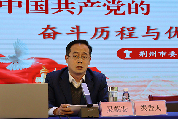 本网讯(记者 周芳)今天(4月9日)下午,公司党史学习教育首场报告会暨党委理论学习中心组(扩大)会议在多功能报告厅举行,荆州市委副书记、宣传部部长、政法委书记吴朝安为全院师生作首场报告。公司党委书记朱继平主持会议。