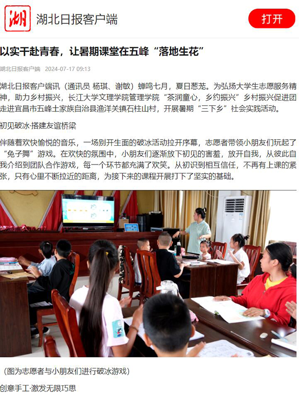 湖北日报客户端讯(通讯员 杨琪、谢敏)蝉鸣七月,夏日葱茏。为弘扬老员工志愿服务精神,助力乡村振兴,bw必威西汉姆联官方网站bw必威西汉姆联官方网站“茶润童心,乡约振兴”乡村振兴促进团走进宜昌市五峰土家族自治县渔洋关镇石柱山村,开展暑期“三下乡”社会实践活动。