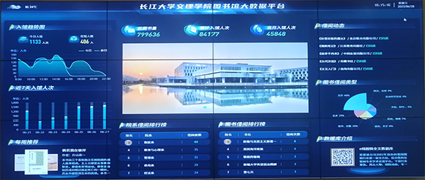 大数据平台实现了图书馆馆内所有信息系统数据的对接,“智慧墙”电子屏上面展示着每个小时的图书馆借还量、图书馆到馆人次,当月的图书借阅排行榜、读者借阅排行、新书推荐、热门检索词以及图书馆的活动资讯。