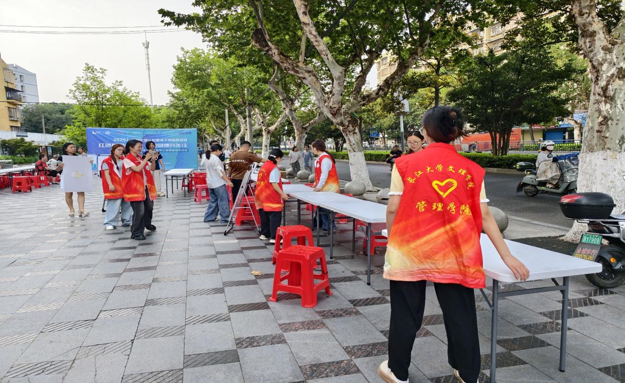 志愿者到达活动地点后,和社区的工作人员一同对活动现场进行了布置,将桌子和椅子进行摆放,将物资放到指定的区域。八点半左右,我们的健康筛查活动正式开始了。