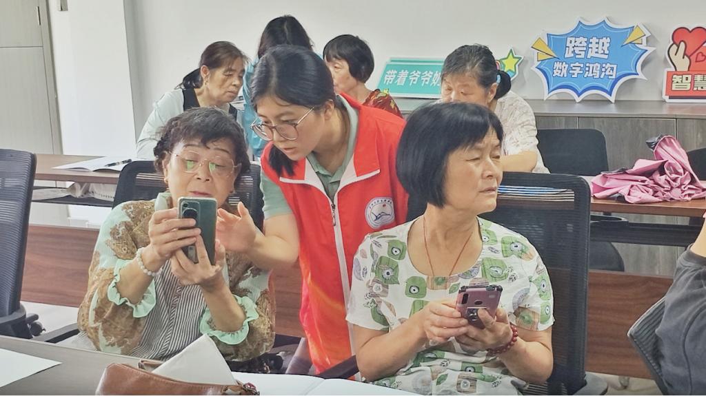 最让老人们期待的,是拨打电话、加微信好友、打视频电话这些实用技能。主讲人一边演示,一边放慢节奏演示操作,助教志愿者们则在座位旁,俯身为老人们调整手机角度、重复讲解操作步骤。细致的讲解与手把手的指导让爷爷奶奶们不禁感叹:“以前怎么都是玩不好的东西,你们今天来一教就会了”。