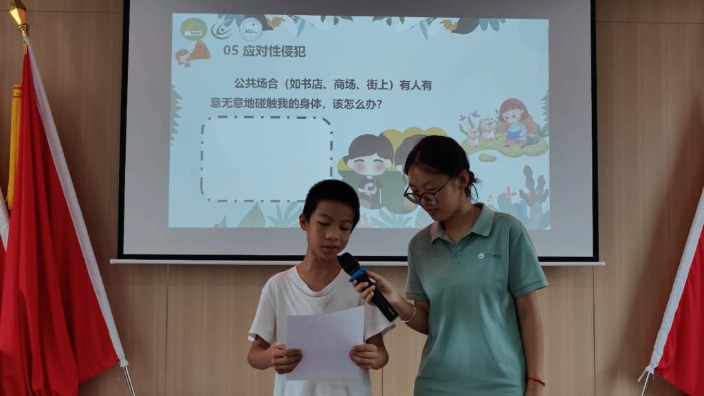 绘本分享结束后,“保护身体小课堂”同伴教育接力展开。志愿者以卡通人体图为教具,用通俗语言讲解隐私部位界定与恰当触碰边界,帮助孩子们建立身体主权认知。被问及“公共场合有人故意触碰身体该怎么做”时,孩子们展开热烈讨论。小助教分发的白纸上,很快写满“大声说‘不要碰我’”“马上跑向穿制服的人”等答案。各组代表自信登台,稚嫩的声音传递出坚定的自我保护意识,赢得在场者阵阵掌声。