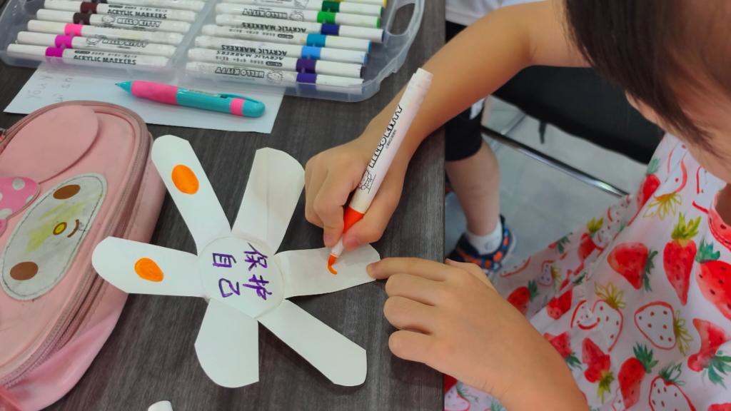 活动尾声的创意手工环节将氛围推向高潮。孩子们在志愿者指导下,用一次性纸杯创作“保护自己”主题花朵。剪刀裁剪出层层花瓣,彩笔描绘出缤纷图案,一个个独一无二的纸杯花绽放,红色花瓣象征“勇敢说不”,黄色花蕊代表“及时求助”,承载着孩子们对安全成长的美好期许。