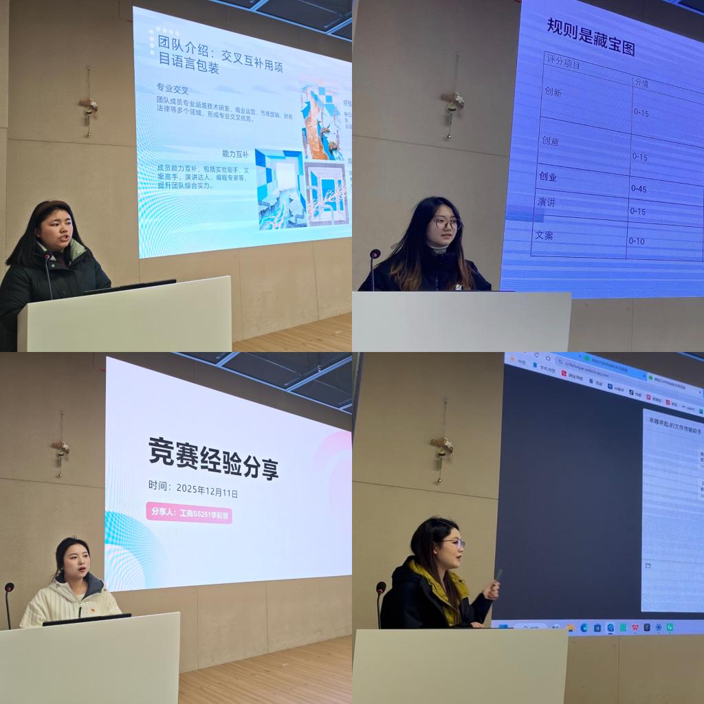 活动现场,四位分享嘉宾结合自身参赛经历,从备赛策略、项目打磨到心态调整等维度展开分享:万学君聚焦竞赛的起点,深入讲解了如何精研“挑战杯”申报书,从框架搭建到细节打磨,强调以专业、严谨的文本呈现项目内核;秦恬茨则侧重于实战策略,系统解析了“三创赛”等实践类比赛的参赛方法论,分享了从团队组建到赛道运营的全流程经验;李彩慧的分享内外兼修,一方面提炼了PPT设计、演讲呈现的核心技巧,另一方面重点剖析了“青年红色筑梦之旅”赛道中志愿服务类项目的申报要点与价值核心;朱雨露直击竞赛最后关卡,以多次斩获金奖的经验,犀利地阐述了答辩路演的通关精髓,包括如何精炼陈述、驾驭现场以及应对评委提问,展现了“临门一脚”的关键能力。四位嘉宾的分享环环相扣,完整覆盖了从项目构思、文本撰写、实战运营到最终答辩的竞赛全链条,为与会同学提供了宝贵而系统的指导。