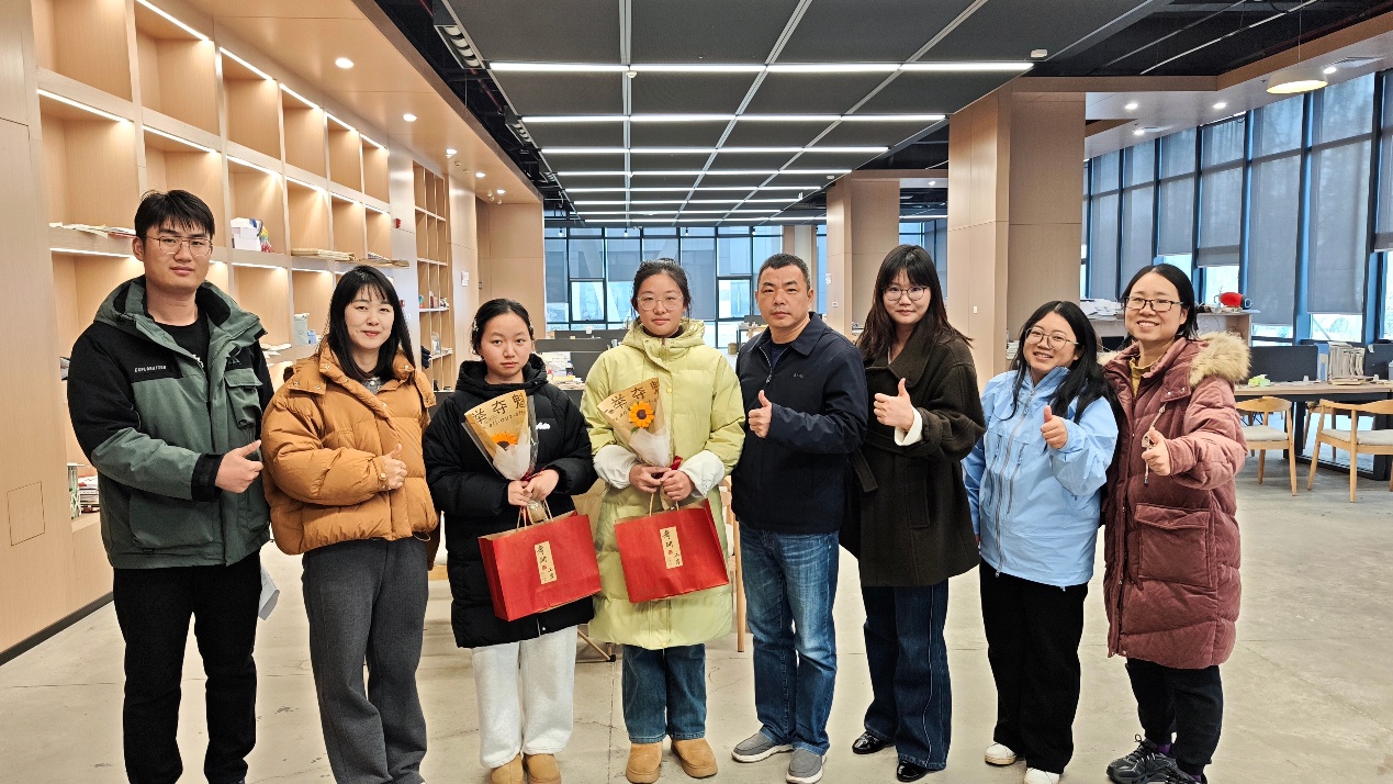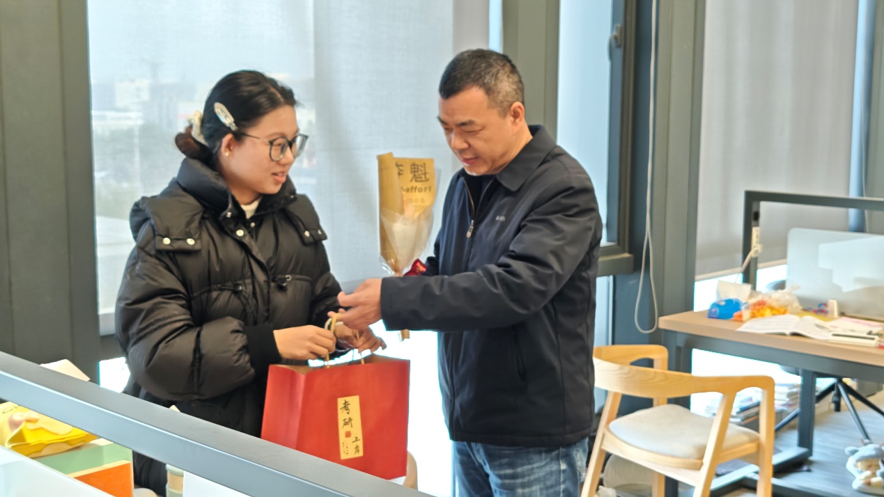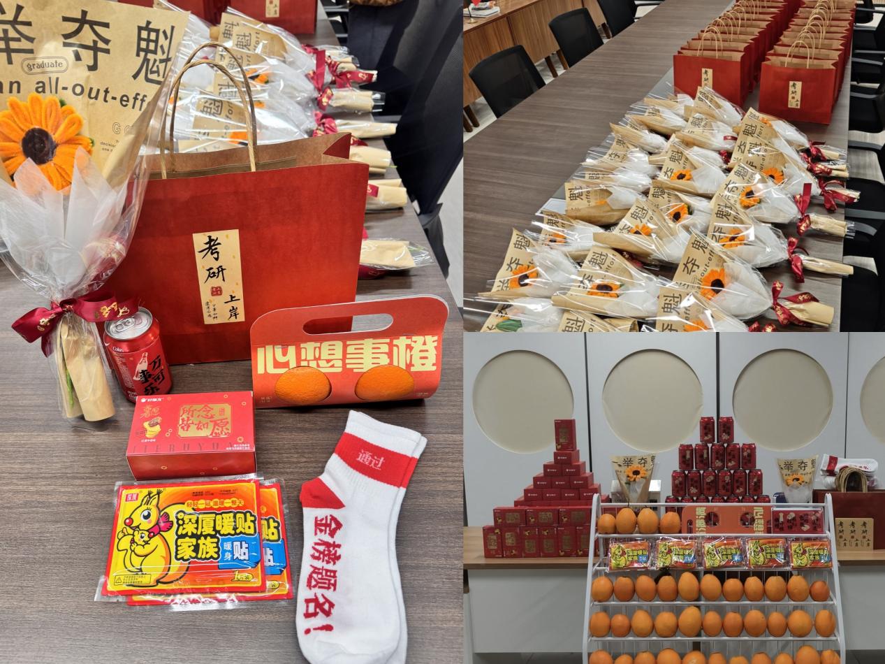 公司精心筹备的“暖心备考包”细致周到、寓意深远,包含暖宝宝、金榜题名袜、橙子、可乐、薯片以及一束由员工志愿者亲手制作的向日葵花束。其中,暖宝宝抵御严寒,呵护身心;袜子在保暖的同时也寓意“稳步前行”,踏踏实实走好备考每一步;橙子象征“心想事成”,寄托对学子们取得佳绩的美好祝愿;可乐代表“乐观向上”,期待同学们保持积极心态;薯片则寓意“薯你最棒”,为复习生活增添轻松一刻。而向日葵始终朝向阳光,象征着希望、信念与不懈追寻,寓示“心向朝阳、一举夺魁”。每一份礼物都承载着公司师生对考研学子最诚挚的鼓励与关怀,让同学们倍感温暖与惊喜。
