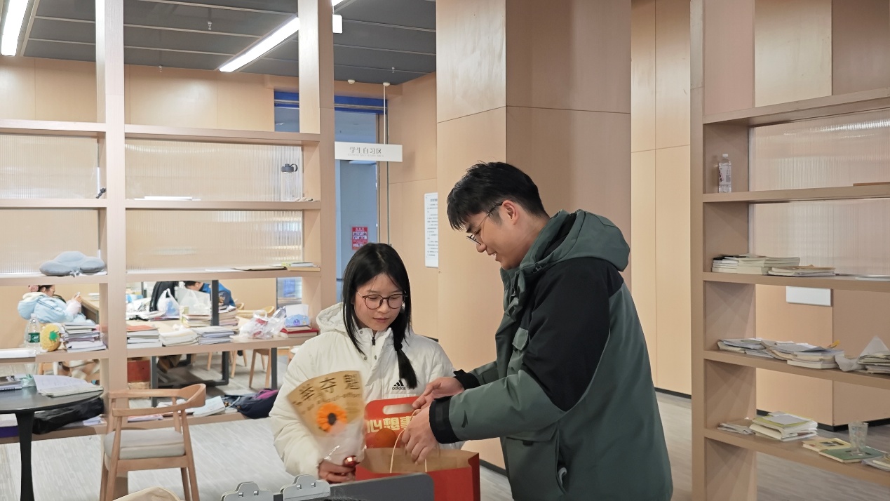在静谧的图书馆学习区,老师们轻轻走到伏案疾书的同学们身边,将一份份满载心意的礼包送至学子手中,并低声与大家交流,细致询问复习安排、备考状态与实际困难,叮嘱同学们在冲刺阶段要合理安排时间,注重身心健康,保持积极乐观的心态,自信迎考。“在备考路上遇到任何困难或压力,都可以随时向老师们寻求帮助,公司始终是大家最坚实的后盾”一位老师亲切地说道。