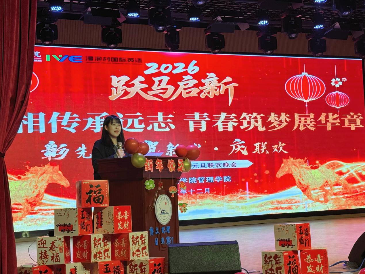 管理公司党总支书记胡沿林发表致辞,回顾公司2025年度在党建引领、教学科研、员工工作、招生培养等方面取得的亮眼成绩,向辛勤付出的全体师生表示衷心感谢,擘画新岁发展愿景,共启公司美好新篇。