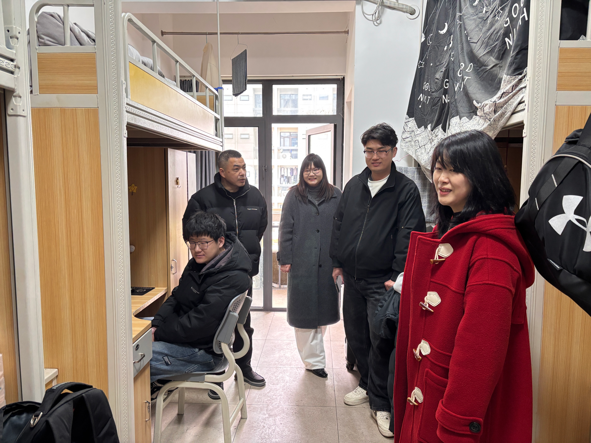 “同学们都回来了吗?假期过得怎么样?”姚经理轻轻敲开了一间宿舍的门,映入眼帘的是正在整理行李和打扫卫生的同学们。同学们纷纷起身问好,原本忙碌的宿舍瞬间充满了欢声笑语。走进宿舍,老师们仔细查看了寝室的设施设备和卫生情况。胡书记摸着一位同学床铺的被褥,关切地询问道:“这被子厚不厚?这几天降温要注意保暖,刚开学要是有什么不适应的,一定要及时跟辅导员说。”一句句贴心的问候,如同一股暖流,流淌在每一位同学的心间。在走访毕业生宿舍时,老师们尤其关注同学们的考研复试和就业进展。叮嘱同学们要是面试中遇到什么‘拦路虎’,记得多和老师沟通,公司的老师都是同学们坚强的后盾。