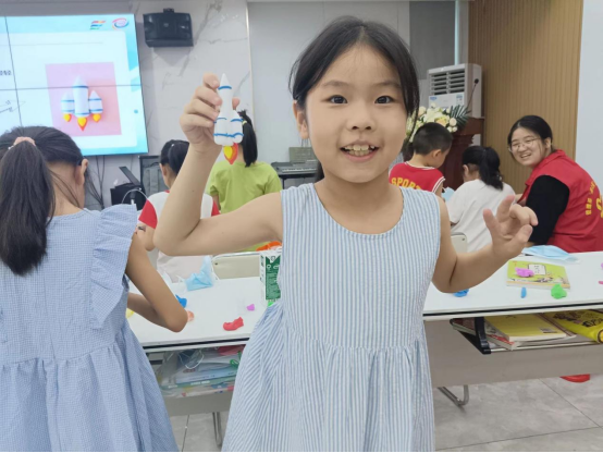 并根据"两弹一星"事迹 带领小朋友利用超轻粘土制作人造地球卫星,核弹火箭等等。大家在用超轻粘土勾勒自己心目中两弹一星的同时,也在心中埋下了一颗颗为国家科技创新的小小种子。
