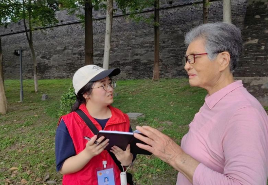 图为志愿者在荆州金凤广场周边进行普通话调研