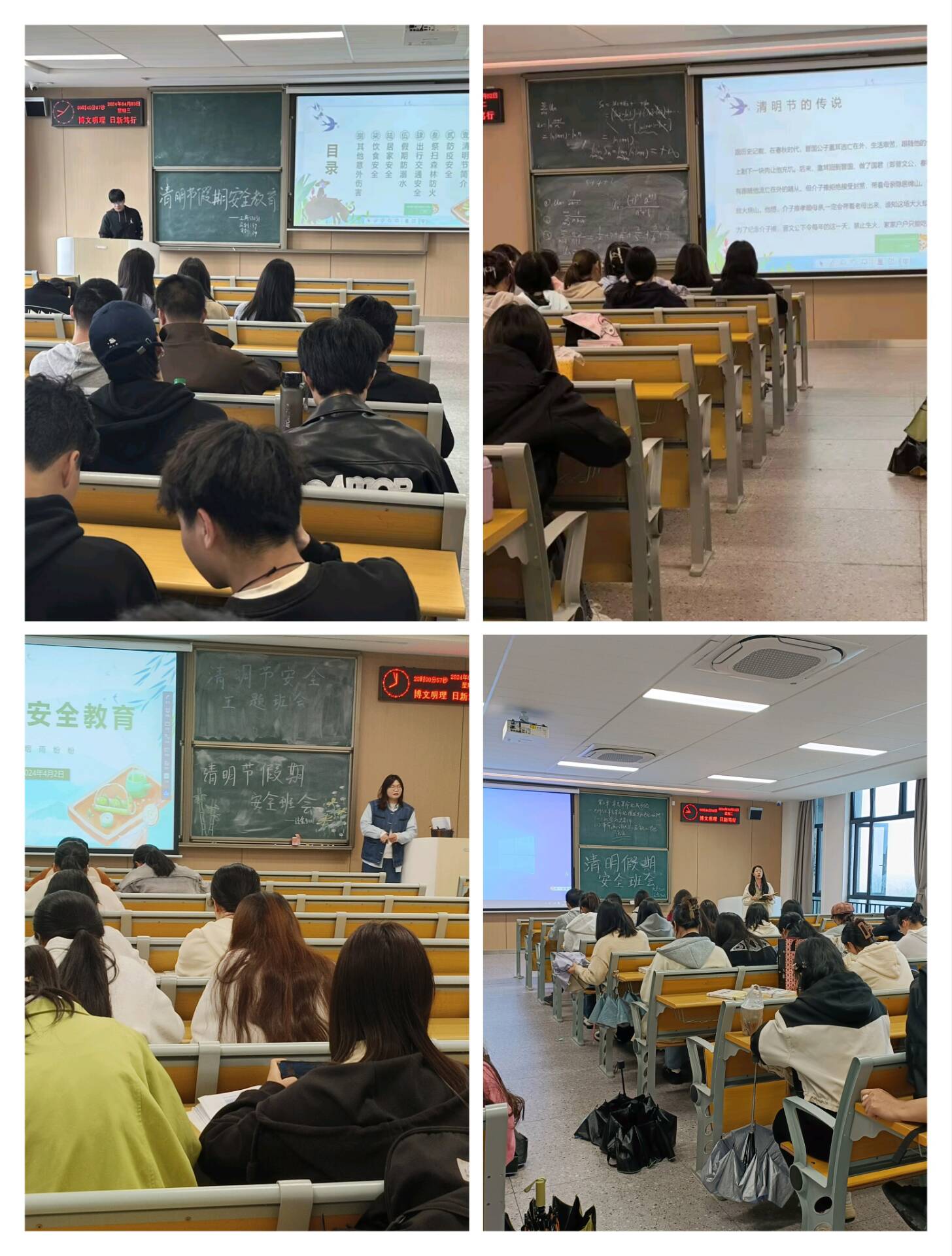 班会上,老师告知同学们清明节的放假安排,提醒同学们提前规划好假期活动,并注意假期期间的安全。同时强调了宿舍违纪的问题。消防及用电安全是此次班会的重点之一。特别提醒留校的同学们要遵守宿舍用电规定,不用湿的手触摸电器,不私拉乱接电线,不在宿舍中使用违规电器等,确保自身的人身和财产安全。也提醒没有留校的同学们,在假期期间要注意交通安全,遵守交通规则,确保出行安全。