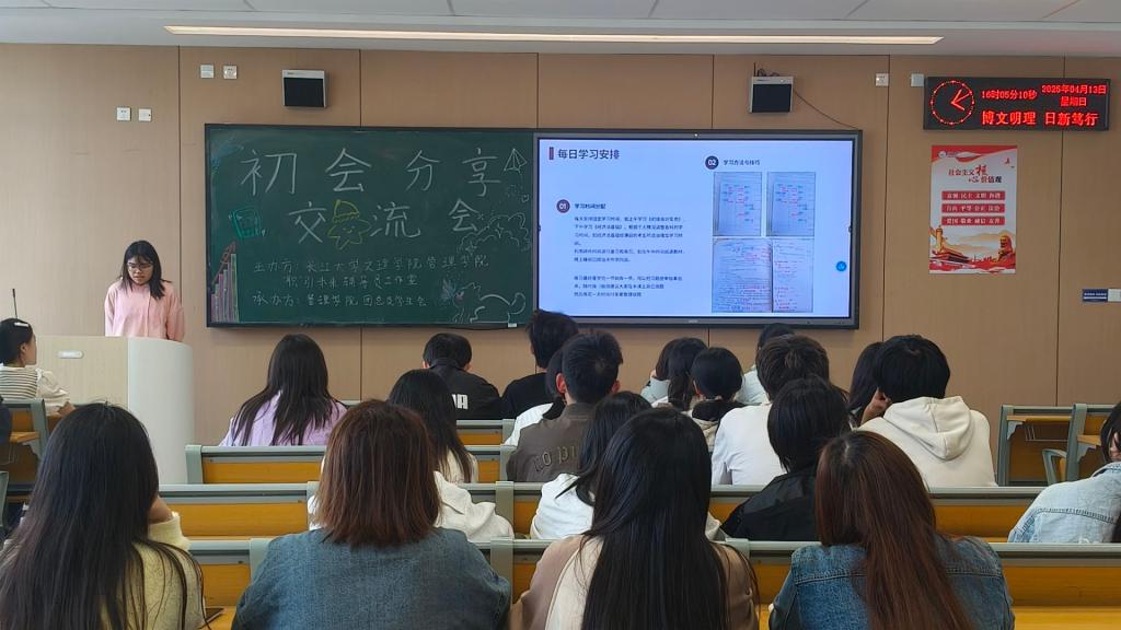 活动开场,主持人点明了本次会议的目的和重要性,并对上台分享的学姐进行了介绍。随后,苏宇碟率先上台,她分享道,备考时要制定科学合理的学习计划,依靠学习难度来进行学习先后顺序的规划,保证知识点的全覆盖,同时她还提到模拟测试的重要性,通过模拟测试来找到自己的薄弱点和易错点。