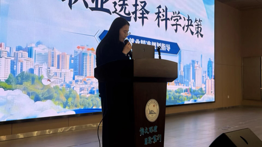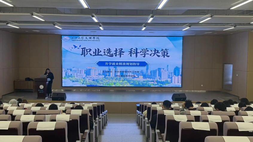 3 月 24 日晚,由职引未来辅导员工作室与中公教育荆州分校联合主办的 “职业选择 科学决策 —— 升学就业精准规划指导” 讲座,在主校区教学楼 B-112 报告厅顺利开讲,讲座面向 2023 级全体本科生,吸引众多学子到场聆听交流。本次讲座由辅导员沈诗涵老师担任主持人,她以平实亲切的表达迅速带领同学们进入讲座主题,为活动开展营造了良好氛围。