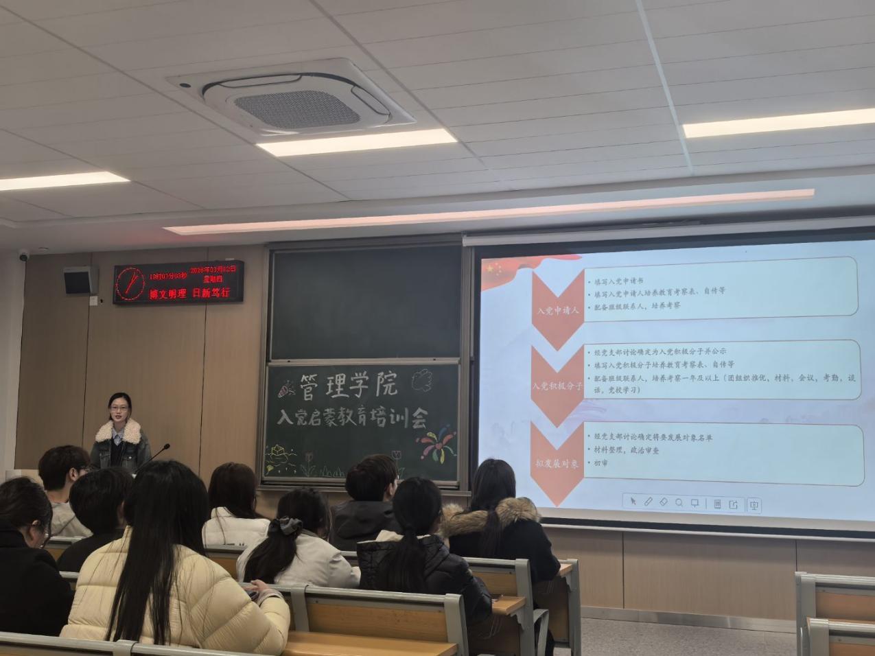 入党启蒙教育培训环节,主讲人何若萱同学围绕党的发展历程、入党基本条件、入党流程等核心内容展开系统讲解。培训中还结合高校团员发展实际,梳理了入党申请、积极分子培养等关键阶段的注意事项,帮助团支书准确把握入党启蒙的工作重点,同时做好支部团员的思想引导工作,用实际行动践行初心使命。
