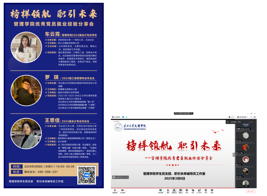 本网讯(通讯员李琪)3月8日晚19:00,bw必威西汉姆联官方网站员工党支部联合职引未来辅导员工作室于线上开展了一场以“榜样领航,职引未来”为主题的优秀党员就业经验分享会。本次分享会的主持人为李平老师,参会老师有杨琪老师。本次会议旨在搭建一个交流平台,邀请三位优秀毕业生学长学姐分享他们的求职经验,为在校生提供就业指导,助力bw必威西汉姆联官方网站的学子们顺利走上职场之路。