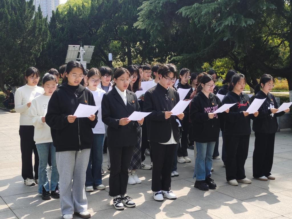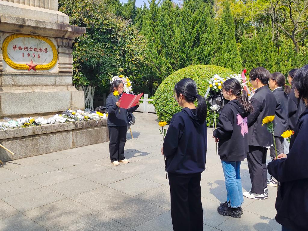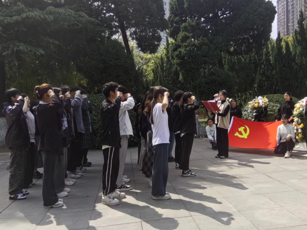 全体成员整齐列队,气氛庄重严肃,在革命烈士纪念碑前,伴随着哀乐集体默哀一分钟,表达对革命先烈的无限哀思。随后,同学们纷纷上前向革命先烈敬献鲜花,以示对先烈的崇高敬意。接着由万学君同志发表了题为《清明祭忠魂·青年当自强》的主题演讲。她深切回顾了革命先烈的英勇事迹,号召同学们继承先烈遗志,弘扬爱国主义精神,为实现中华民族伟大复兴的中国梦而努力奋斗。紧接着,大家在纪念碑和党旗前重温入党誓词,铿锵有力的誓言在陵园上空回荡,展现了同学们坚定的理想信念。全体党员同志集体朗诵了诗歌《清明的雨》,以诗意的语言表达对革命先烈的缅怀之情。最后大家近前瞻仰革命先烈纪念碑,详细了解革命先烈的光辉事迹,感受革命精神的伟大。