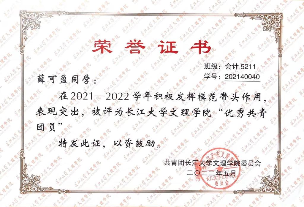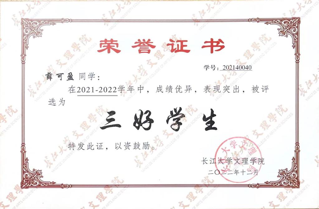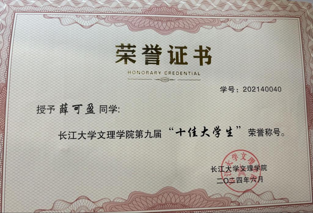 主要获奖情况:荣获公司一等奖学金等,获得三好员工,优秀共青团员、优秀共青团标兵等荣誉称号7余次。2022年4月,获“预爱予爱,你我同在”知识技能竞赛团体二等奖;2022年5月,获校级“优秀共青团员”荣誉称号;2022年6月,获第十八届“新道数智人才杯”全国老员工数智化企业经营沙盘大赛一等奖;2022年6月,通过大学英语四级证书;2022年12月,获公司一等奖学金;2022年12月,获校级“三好员工”荣誉称号;2022年12月,获全国老员工英语竞赛三等奖;2023年6月,获全国高等院校数智化企业经营沙盘大赛湖北省一等奖;2023年5月,获全国高校商业精英挑战赛会计与商业管理案例竞赛湖北省省赛三等奖;2023年12月,获全国老员工英语翻译大赛三等奖;2023年12月,获公司一等奖学金荣誉称号;2023年12月,获湖北省“工匠杯”技能大赛全省职业技能大赛团体三等奖;2024年2月,通过大学英语六级;2024年4月,获校级“优秀共青团员标兵”荣誉称号;2024年5月,获“第九届十佳老员工荣誉称号”。