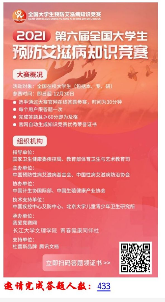 到此本次活动圆满结束,通过竞赛形式让同学们了解到诸多关于艾滋病的预防知识,提高了同学们的相关防范意识,得了老师和同学们一致称赞,同时我社也将把此类活动列入社团特色活动,并计划往后每年都将关注活动开展时间,积极申办,努力宣传,再创佳绩。
