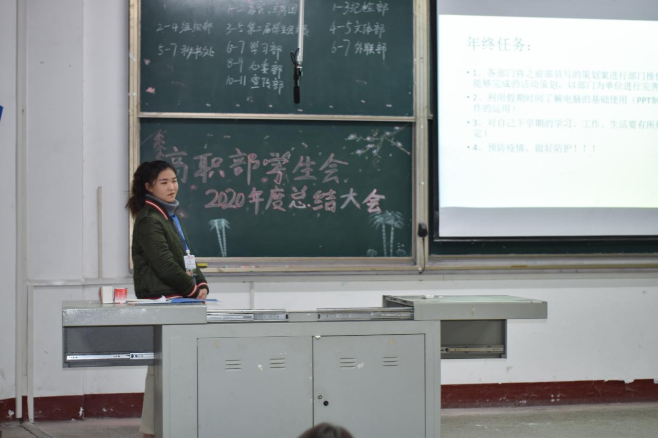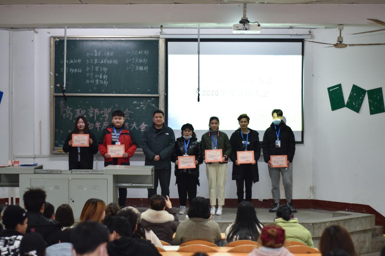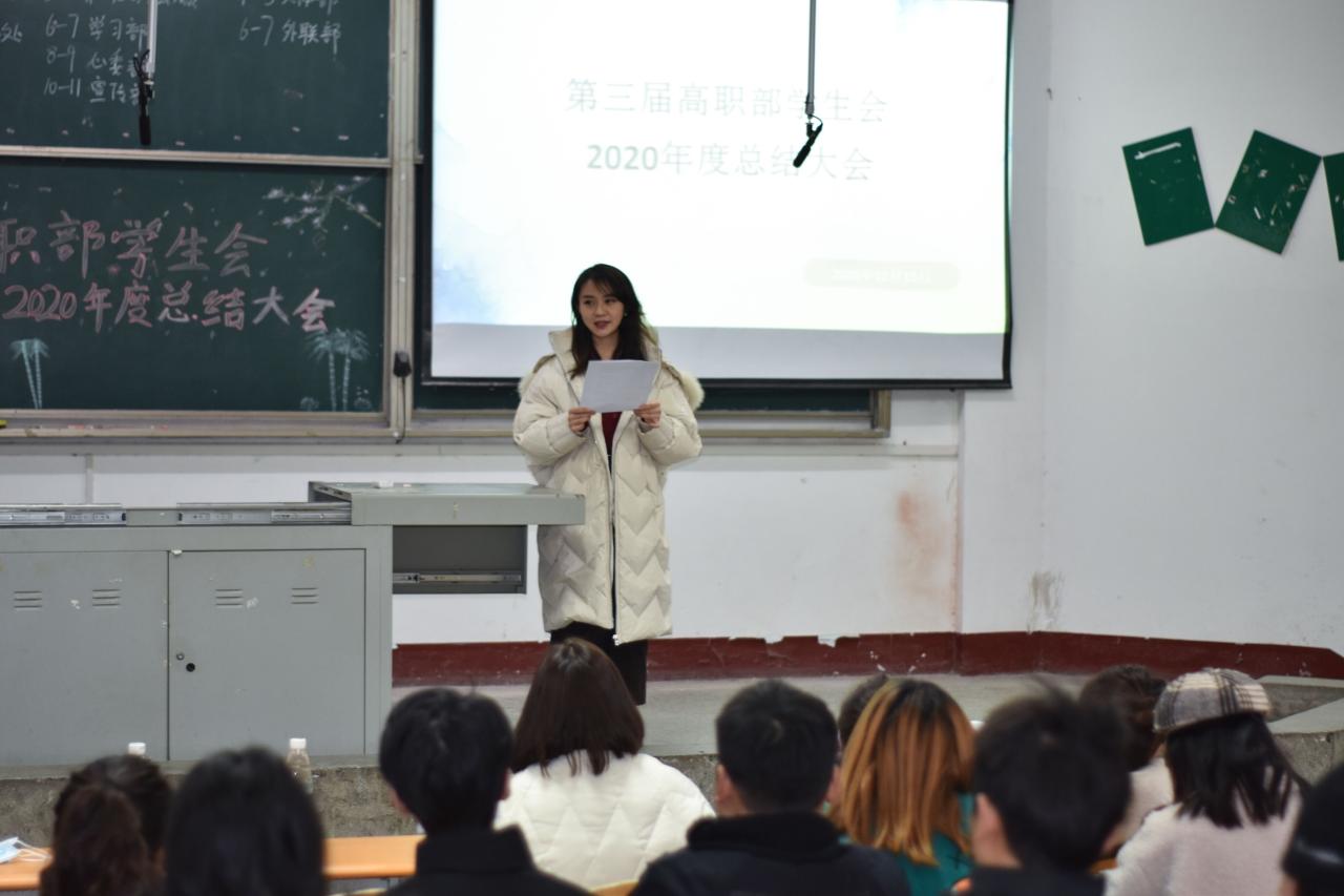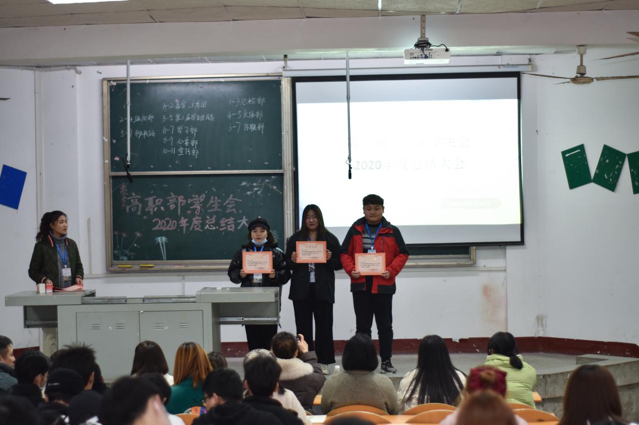 2020年度员工会工作即将结束,为推动高职部员工会工作更好更强更长久的发展,保证员工会新旧成员交接后能够更快的正常运转,同时对上一年度在工作中表现突出的员工会干事给予表彰,高职部员工会在西校区四教200召开了2020年度总结大会。此次大会共七项:第一项、由主持人介绍出席本次会议的嘉宾;第二项、高职部员工党支部书记黄婷婷老师上台讲话;第三项、颁发证书;第四项、各部门依次上台作工作汇报;第五项、第三届高职部员工会主席团成员代表周海静上台发言;第六项、高职部员工会指导老师王瑆皓老师上台发言;第七项、主持人宣布会议结束。