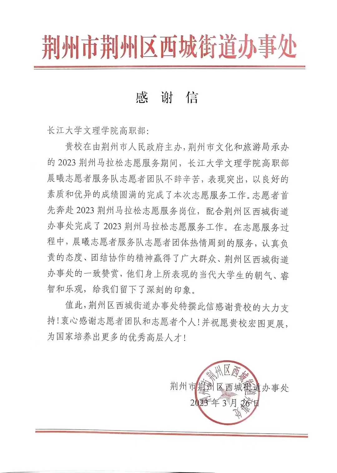 本网讯(通讯员王坦)近日,我系部收到来自荆州市荆州区西城街道办事处的感谢信,信中对我系部晨曦志愿者服务队配合西城街道办事处完成2023荆州马拉松志愿服务的工作表示感谢。