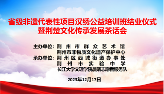 本网讯(通讯员王晓芸)2023年12月17日,荆州市非遗中心联合西城街道办事处、bw必威西汉姆联官方网站晨曦志愿者服务队分别在实验中学附属小学和西城街道办开展了2023年省级非遗代表性项目汉绣公益培训班,通过48个课时已全部结束。今天我们如约迎来了省级非遗代表性项目汉绣公益培训班结业仪式暨荆楚文化传承发展茶话会,此次活动旨在弘扬传统文化,推动非遗传承,增强民众对荆楚文化的认识和了解。