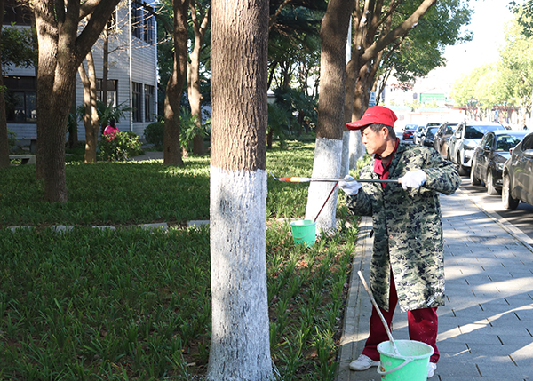 今天(11月10日)上午,后勤保障处安排一批工人正在对城中校区主干道两侧树木进行刷白。大家按照比例配置涂白石灰,细心涂刷,确保树穴、地面干净整洁,使涂白树干高度统一、颜色均匀,让校园树木保持美观一致的同时,起到良好的防病虫害效果。据悉,此次将对城中和西校区的千余株树木进行刷白,工期20多天。员工记者 李彦君 熊嘉怡 见习记者 赵安欣 摄影报道