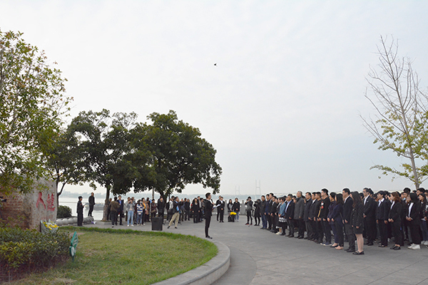 祭奠仪式包括宣读祭文、默哀、向烈士敬献黄菊等环节。伫立在庄严肃穆的“人链”碑前,全体人员怀着凝重的心情追思英烈,聆听新生代表宣读祭文。全体默哀三分钟后,冯征、周从标、朱继平、孙细望等领导及英雄集体代表依次将黄菊放在纪念碑前,深深鞠躬。