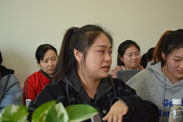 回忆起初为人师的历程,杨可热泪盈眶(东莞市寮步镇致上幼儿园 2018年12月19日摄)。