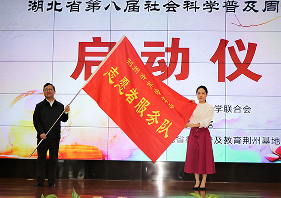 会上,荆州市委宣传部常务副部长周宏智为荆州市社会科学志愿者服务队授旗。公司建筑与设计系党总支副书记关莉红老师,作为荆州市社会科学志愿者代表接旗,并上台宣读社会科学志愿者倡议书。