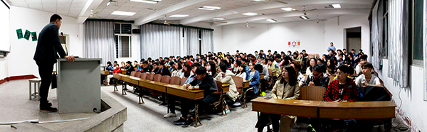 本网讯(通讯员 李倩)3月27日晚,中国地质大学环境工程专业、日本筑波大学研究生肖慈开同学和袁桢同学应邀做客公司,与建筑与设计系视觉传达专业、环境设计专业260余名师生一起分享、交流了他们赴日研读设计类专业的两年研修生活。