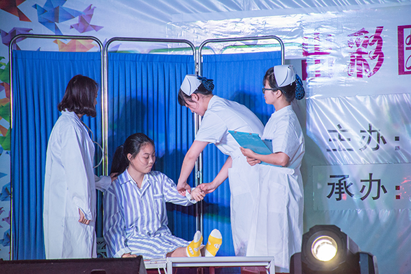 在欢快的鼓乐声中,比赛拉开帷幕。同学们带来手语《感恩的心》、小品《上岗》、话剧《医者仁心》、相声《医生与护士》、情景剧《同桌的你》、对唱《明天会更好》等节目,用饱满的激情歌颂了白衣天使守护健康、燃烧自己的奉献精神,丰富多彩的艺术表演赢得现场观众声声赞叹。