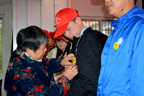 失独家庭代表为青年志愿者佩戴志愿微笑徽章