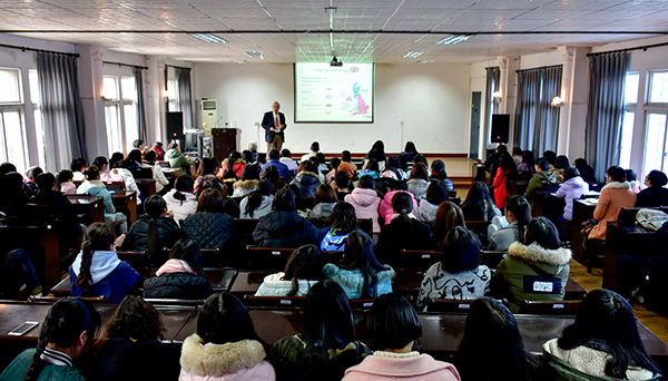 当天下午,在公司学术报告厅,克库伦教授、米歇尔·斯图尔特女士、王娟向外语系和人文与传媒系大一员工作了留学咨询,分别介绍了思克莱德大学的校园环境、教育资源、留学政策以及双方交流合作的具体项目,同学们现场咨询了有关问题,英国老师一一详细解答。