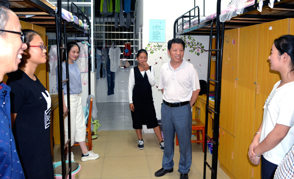 在城中校区,梅平一行先后来到7号、5号员工宿舍楼,看望了外国语系、工商管理系、人文与传媒系的新同学,与大家亲切交流,了解同学们度过大公司园里第一夜的感受。“挺好的,有些兴奋、好奇!”在7舍315寝室,一群活泼的中文专业女同学抢答;在136寝室,梅平询问了宋思思同学的家乡,宋思思有点害羞的回答说:“在湖北咸宁赤壁。”经理问:“宿舍住的习不习惯?”同学们说:“跟家里差不多,开了空调,挺凉快!”在124寝室,梅平还邀请会计学专业的同学们合影留念,他交待工商管理系党总支书记沈爱龙和身边的工作人员:“一定要全心全意把员工培养好,这是我们的责任与担当。”激动的新同学们目光中饱含对新生活的期待和向往。