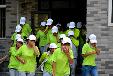 14时45分,在烟雾弥漫中,632名身着军训服的新生,按照动作要领弯腰低身、用湿毛巾捂鼻,分别从东、南、西三侧楼梯出口往外逃生,在相关人员的指挥和引导下,有序疏散到篮球场。15时,最后一批同学在辅导员和校园安保人员的护送下安全撤离,演练圆满结束。