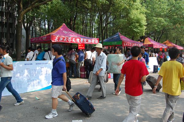 9月5日上午,灿烂的阳光散满校园,徐徐微风中彩旗飞扬,拖着行李的同学们青涩的脸上洋溢着笑容,阔步走进校门,2009届新生迎接工作开始了。记者到达迎新现场时,公司西校区已是人山人海,每一个专业报到处都挤满了新生和陪同的家长。