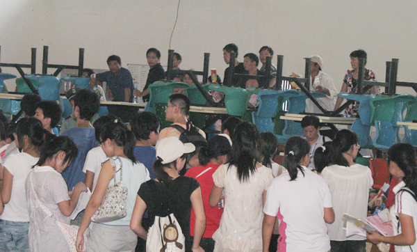 郑瑾这个清秀的小女生也是今天一早就带着“家当”赶到公司报名注册的,和她一起来的还有妈妈和爷爷。小瑾是家里的独生女,爸爸妈妈和爷爷奶奶都非常宠爱她,这次来公司报名,已是满头银发的爷爷说什么也要同行。烈日下,爷爷满头大汗的跑前跑后,懂事的小瑾劝说爷爷到一片树荫下面休息,可是爷爷却不肯,无奈之下,一家人只好让爷爷在树荫下休息顺便看行李,接下来由妈妈陪孩子去办手续,老人这才放心。来到缴费现场,由于谢绝家长进入,妈妈只好在旁边的就餐区一直盯着自己的女儿办理手续。一个人排队办理户口、保险、注册,在刷卡交学费现场,慌忙之中小瑾按错了银行卡密码,系统提示:密码错误,这是现场的工作人员安慰她:“不着急,仔细想想密码,然后重新输一遍。”小瑾擦擦汗,然后再次输入密码,操作成功,终于舒了一口气。