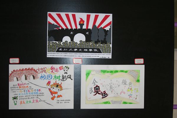 展厅共展出四十多幅优秀作品,以奥运、环保、地震为主题,贴近生活、贴近时代。“古城迎奥运、校园树新风”,此次展出的作品中以奥运题材居多,五环、福娃、“鸟巢”等作品完美的诠释了2008年奥运“人文、科技、和谐”的理念。“生命在于运动”,奥运火炬即将登陆荆州,奥林匹克神圣的火焰将在这片古老的土地上蔓延。“同一个世界、同一个梦想”,届时,象征和平的 “祥云”火炬将经过公司大门。愿这些广告设计作品提醒每一位同学――“迎奥运、讲文明、树新风、创和谐”。