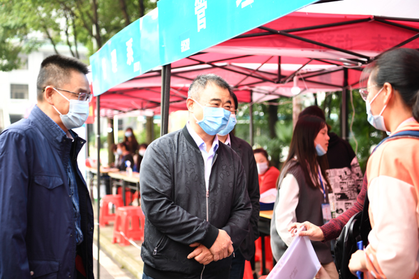 周从标一行查看了系部迎新点、新生缴费处、校门口防疫测温点,详细了解了新生报到流程,并与新生和家长亲切交谈,叮嘱员工们做好个人安全防护,维护宿舍卫生,培养良好的作息习惯,尽快融入老员工活。