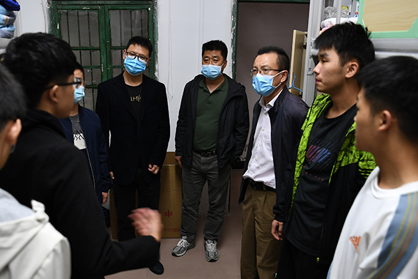 经理王文凯(右一)、党委书记朱继平(右二)进寝室看望新生