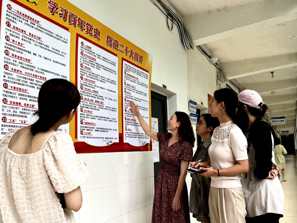 本网讯 6月27日下午,教育与心理系教工党支部开展了题为“共学新思想,喜迎建党日”主题党日活动,党总支书记李刚英带领党员参观党史学习教育长廊,现场讲解党的百年奋斗历程,给全体党员上了一堂生动的党课。全体党员还参观了员工党支部制作的“和光同尘,风采展示”党史学习手抄报及全体党员的党史学习心得,并就新思想学习心得进行了交流探讨。(通讯员 彭盼 摄影报道)