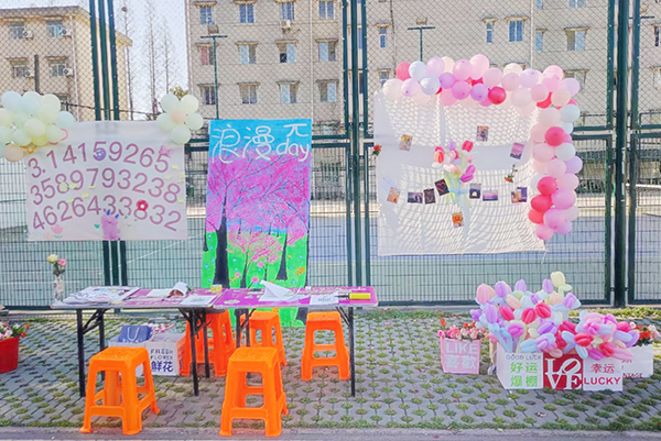 活动现场,同学们可以在π中找到属于自己的数字,写下自己认为最有意义的事进行分享,或者在布置好的漂亮场景“π”下进行拍照后发到朋友圈或者QQ空间,参加任意一个活动都能领到鲜花或气球。现场活动气氛热烈,吸引了数百名师生参加。