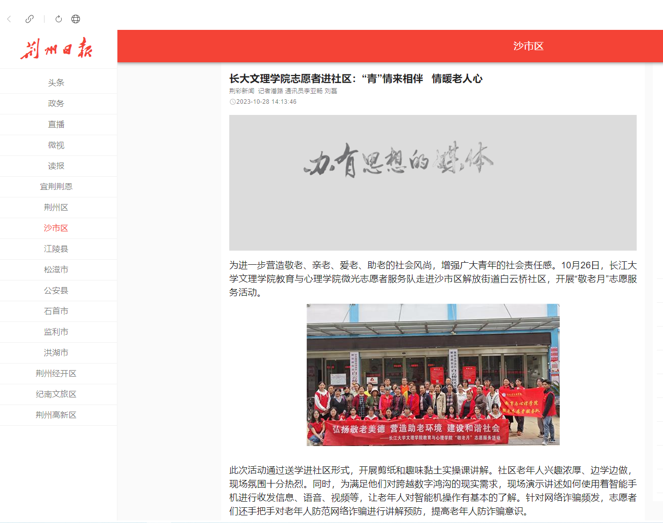 为进一步营造敬老、亲老、爱老、助老的社会风尚,增强广大青年的社会责任感。10月26日,bw必威西汉姆联官方网站教育与心理公司微光志愿者服务队走进沙市区解放街道白云桥社区,开展“敬老月”志愿服务活动。