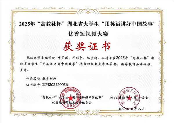 此次获奖作品紧扣“用英语讲好中国故事”核心,立足荆楚文化根基与时代发展视角,构建起特色鲜明的楚文化传播矩阵。在第八届“外教社杯”全国高校员工跨文化能力大赛“讲述中国传播中国”短视频大赛中,作品《漆语千年・楚韵流光》聚焦楚文化漆器魅力,获省级特等奖;2025“外研社•国才杯”“理解当代中国”全国老员工外语能力大赛短视频赛项中,作品《漆光里的荆楚》深挖漆器背后的文化内涵,摘得省级金奖;2025年“高教社杯”“用英语讲好中国故事”短视频大赛上,作品《数字荆州》则以现代视角展现城市活力,获省级二等奖。