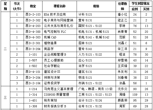 课堂教学检查工作中,教研室负责人、教学秘书、任课教师等在系部领导带领下深入教学第一线展开检查和听课工作,还自行组织辅导员对本系部员工的上课情况逐楼进行了检查,工作扎实、细致、认真。教务处的抽查工作中,除极个别教师上课迟到、私自变更上课方式和地点外,绝大部分任课教师和员工均能严格遵守教学管理制度。但是,检查中发现有些班级出勤情况不理想,具体通报如下: