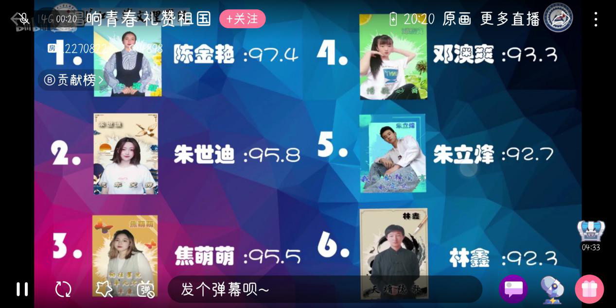 本网讯(员工记者 刘文婷)5月28日晚七点,在哔哩哔哩线上直播平台,由我系承办的第十四届“泮池五月风”科技文化节之“唱响青春,礼赞祖国”校园歌手大赛闭幕式如期隆重举行。比赛由物联5191孔宝宝主持,特邀员工工作部副部长、心理中心主任李刚英、人文系副主任徐霄、机电系王琳、经法系熊慧、设计系鲁倩五位老师担任评委。在这里,同学们的歌声唱响、音符飘扬、青春激荡、梦想起航,现场气氛点燃,激情与梦想不断擦出火花,在线观众人数高达五千多人。