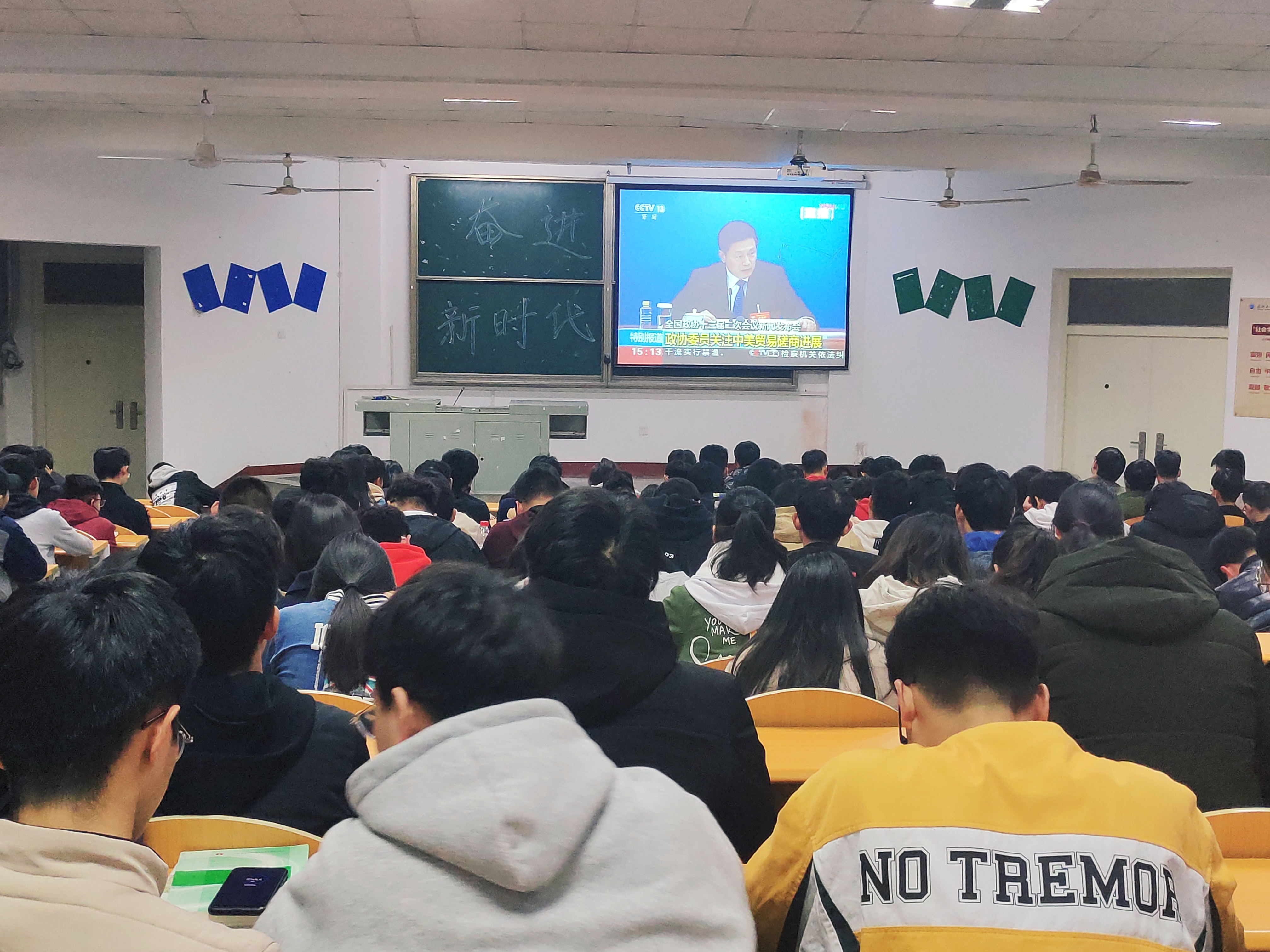 本网讯(员工记者 刘瑞华)3月14晚,机电系18级全体员工到4教200集中收看有关十三届两会视频,意义在于深入学习和全面贯彻落实习近平新时代中国特色社会主义思想,牢固树立我系员工“四个意识”,坚定“四个自信”。