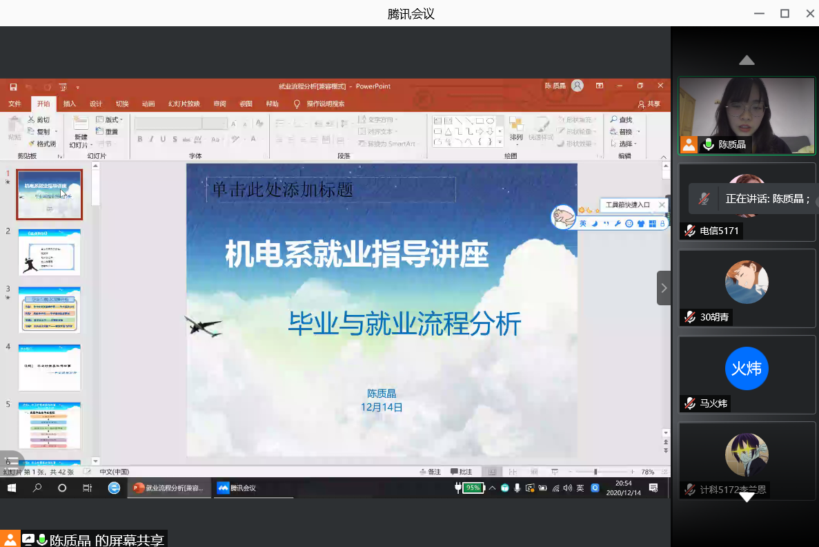 本网讯(员工记者 黄懿萱)针对毕业生近期或今后毕业、就业、签约中遇到的问题,12月14日晚,在腾讯会议平台,我系开展以“毕业与就业流程分析”为主题的2021届毕业生线上就业指导讲座。讲座由辅导员陈质晶主持,2021届全体毕业生参加。